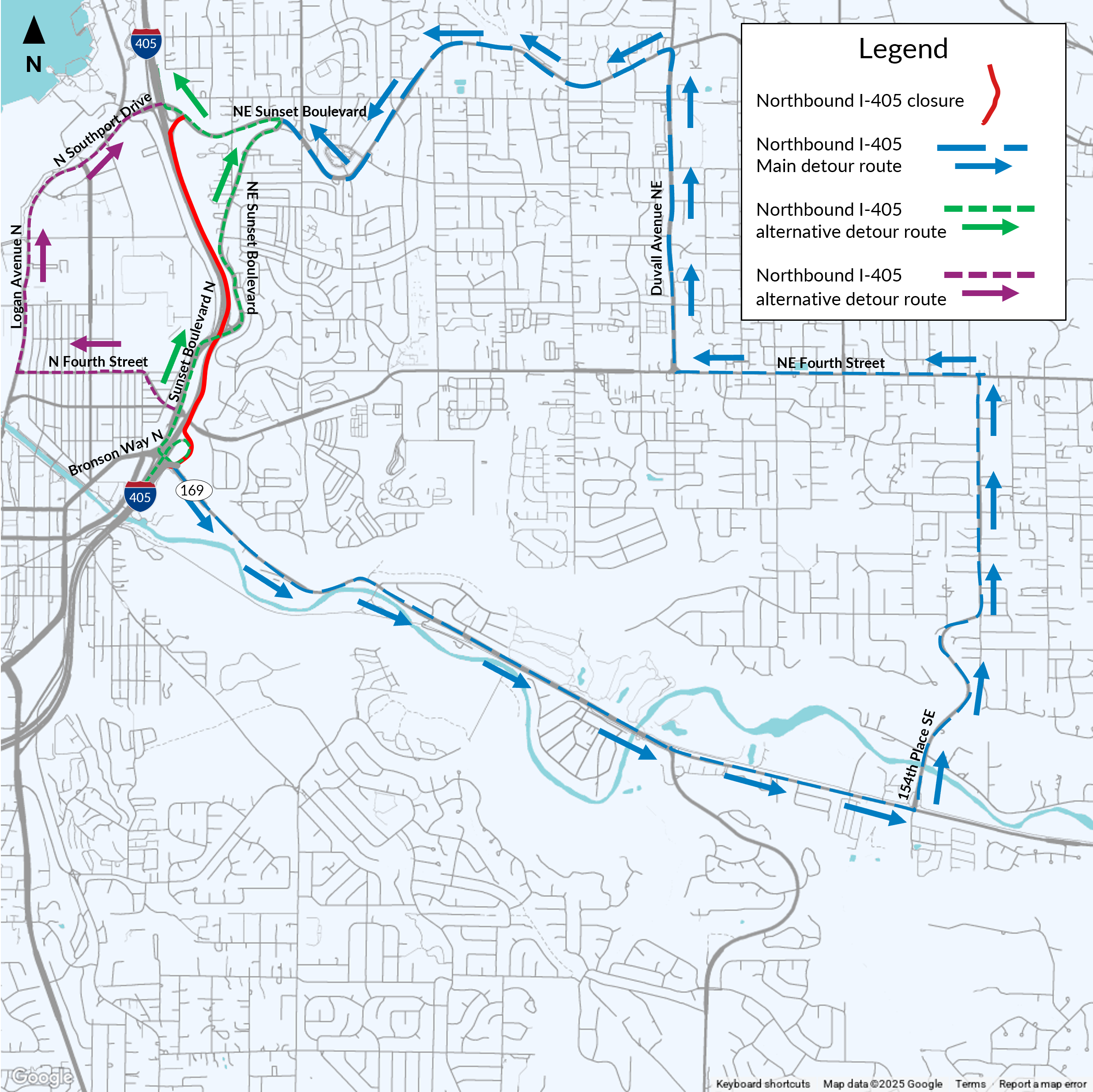 Northbound I-405 in Renton will be closed from SR 169 (Exit 4) to Sunset Boulevard Northeast from 11:59 p.m. Friday, July 11, to 4 a.m. Monday, July 14. Crews will install drainage and replace overhead sign structures and pavement panels. A signed detour route will be in place.