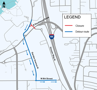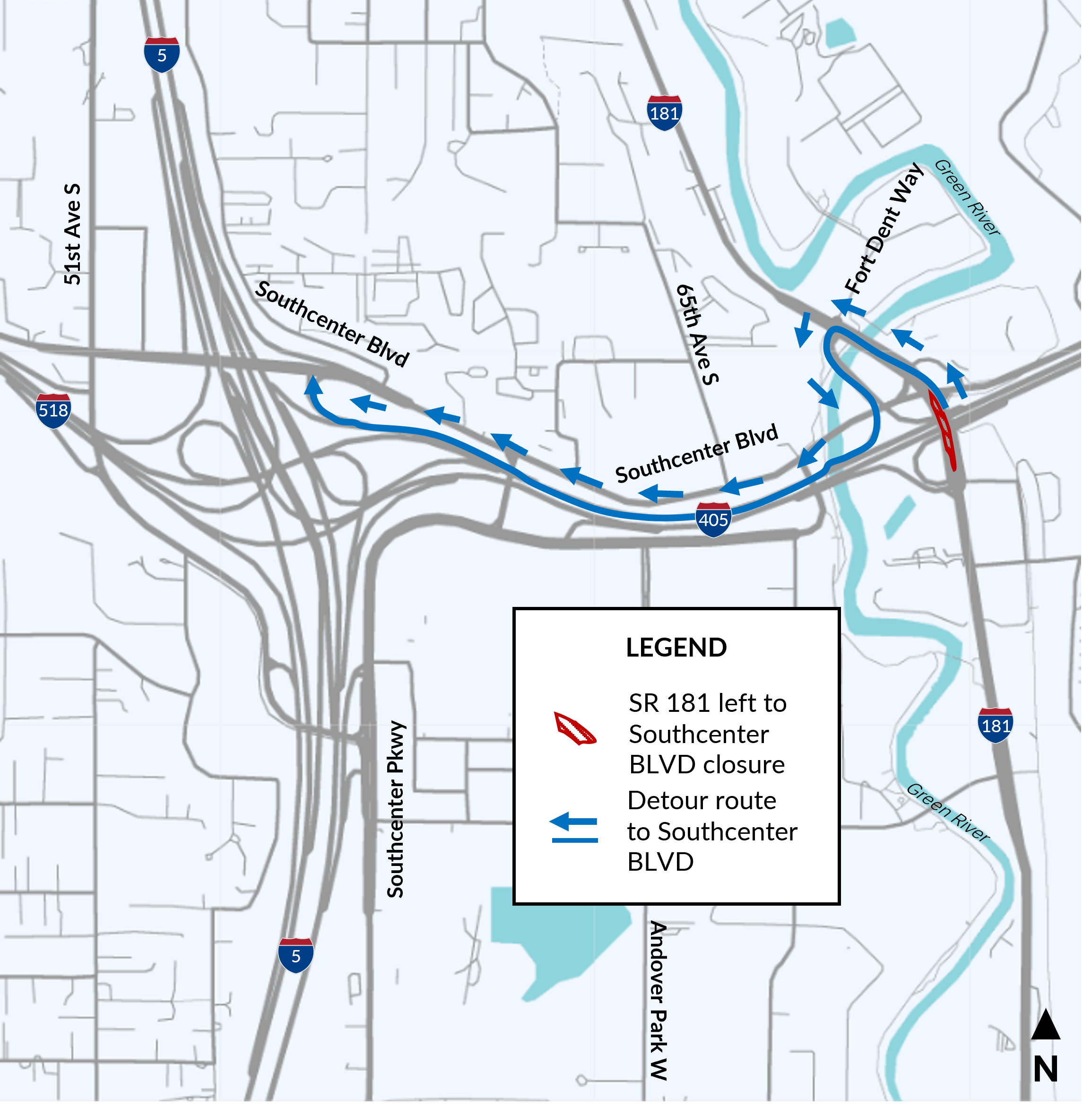 The northbound State Route 181 left turn lane to Southcenter Boulevard in Tukwila will be closed starting at 11:15 p.m. Monday, August 18. A signed detour route will be in place, where northbound SR 181 travelers will continue to Fort Dent Way, use the on-ramp to southbound I-405, and take the Seattle/Southcenter Boulevard exit.